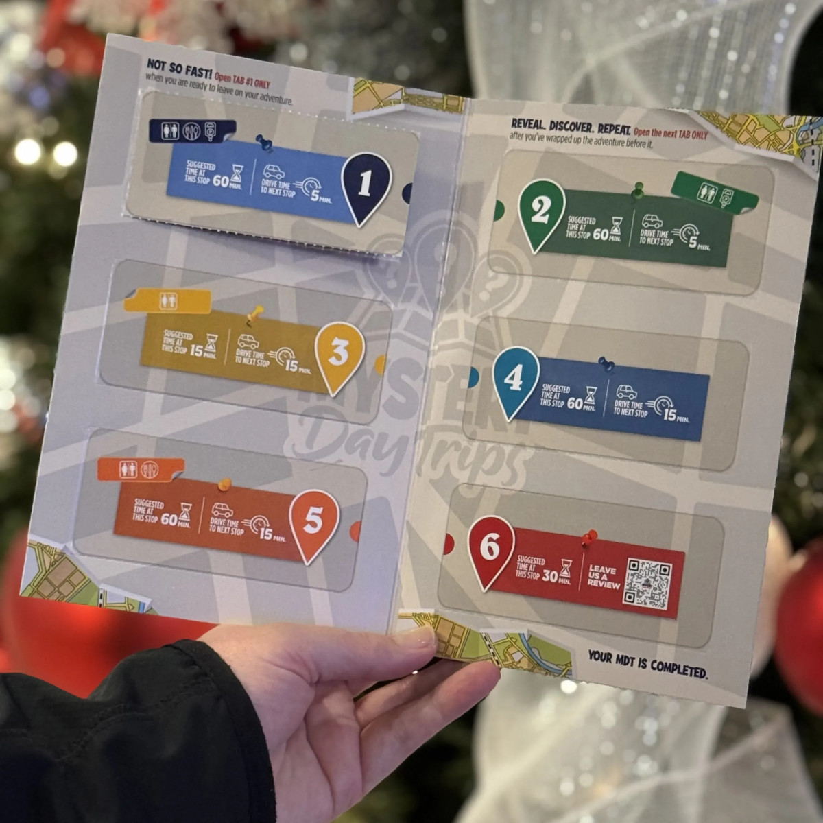 At the heart of each mystery day trip is a specially designed peel-to-reveal itinerary card. This greeting-card-sized card features six numbered tabs that guide travelers through their adventure step by step. As participants peel back each tab, they unveil the next destination or activity, creating an engaging and interactive experience. This format not only adds an element of surprise but also enhances the overall enjoyment of the journey, allowing travelers to immerse themselves in the adventure without knowing what lies ahead.